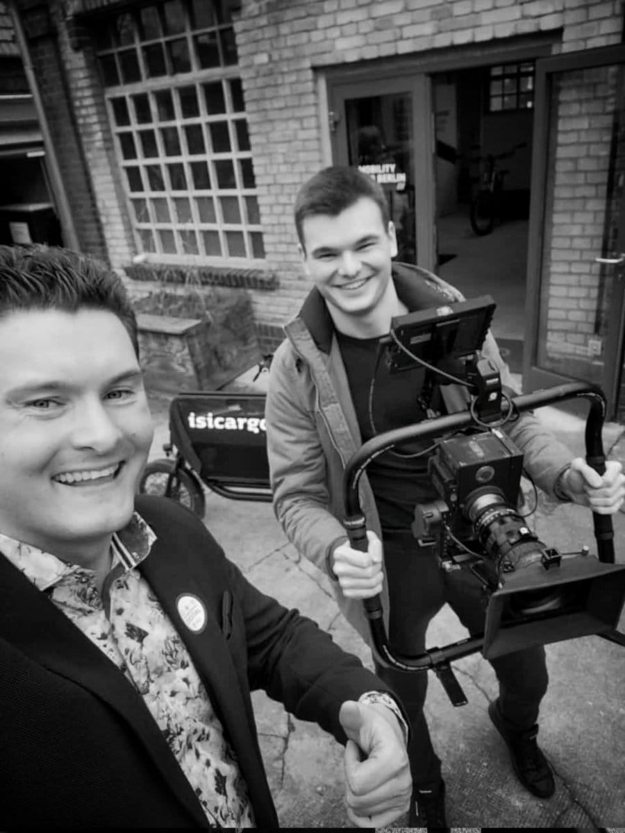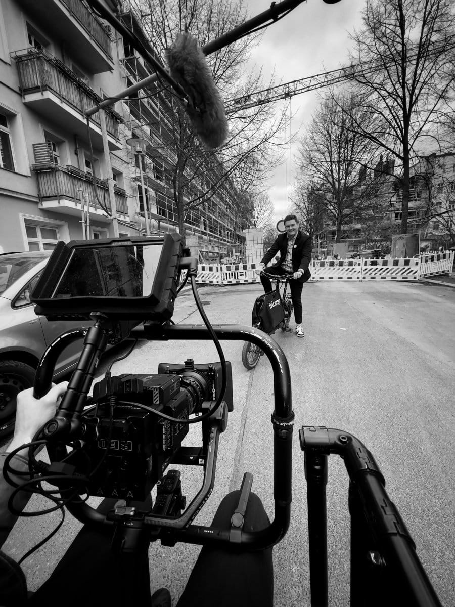 Am zweiten Tag ging es dann raus auf die Straße. Gemeinsam mit easycargo entstand eine etwas andere Drehsituation. Während Phillip auf einem Lastenrad unterwegs war, saßen wir zu dritt auf dem Kameralastenrad direkt vor ihm. Eine ungewöhnliche Konstellation, die nicht nur für Aufmerksamkeit gesorgt hat, sondern auch für Aufnahmen, die man so nicht alle Tage sieht. Ein intensiver und vor allem unvergesslicher Drehtag.